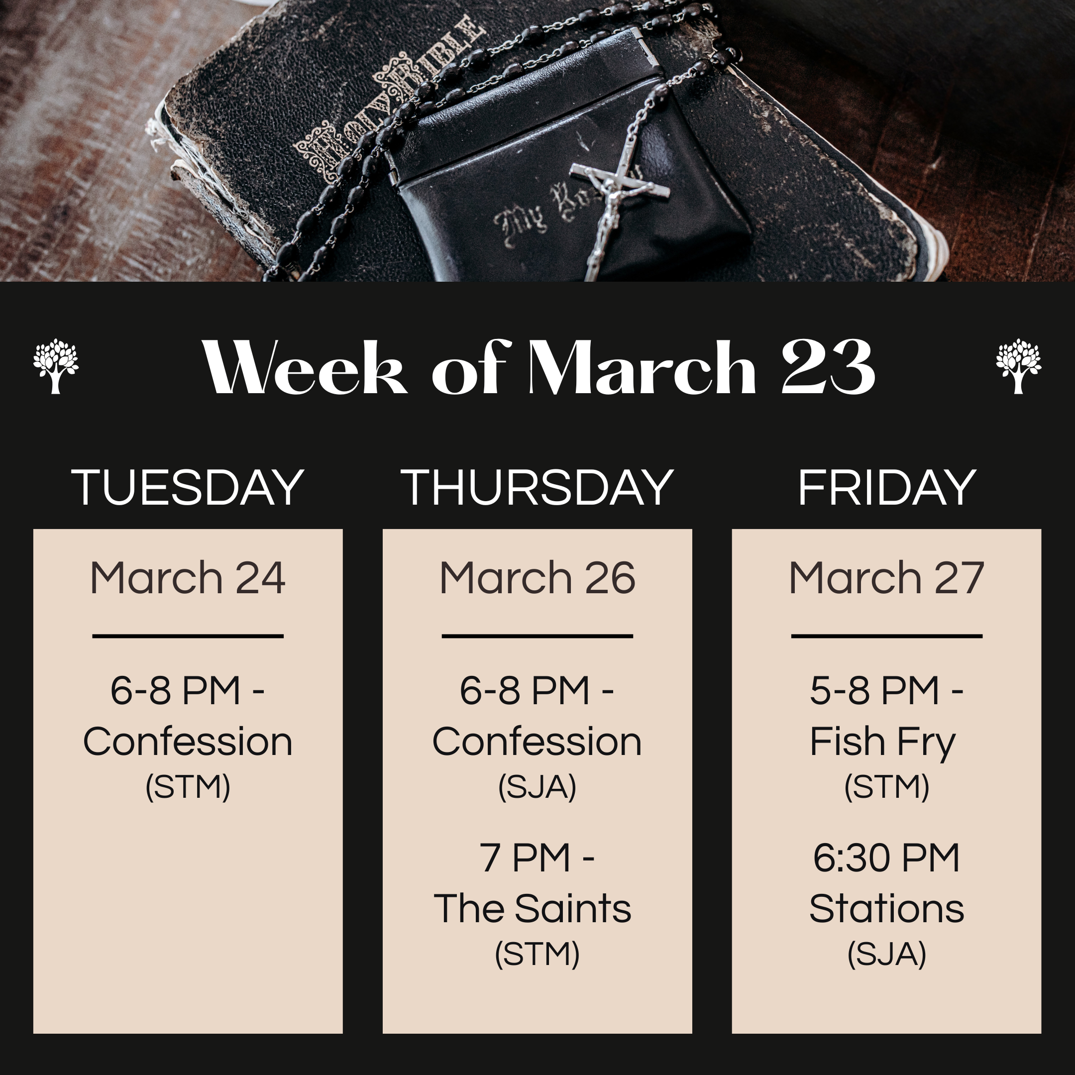 Sunday, March 29 – 8 AM @ SJA, 10:30 AM @ STM, 4:30 PM @ STM
